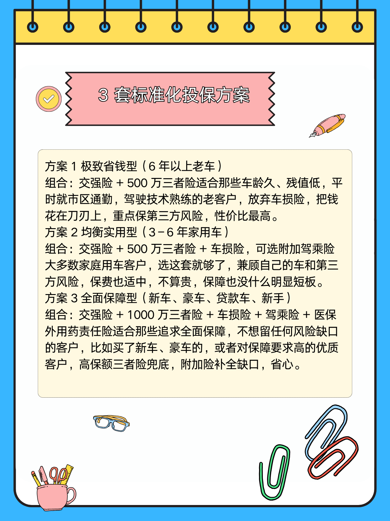 平时跟客户沟通,我整理了 3 套标准化的投保方案,不用每次都重新算、重新说,按客户的车龄、需求对号入座就行,省了不少事,同行们也能直接用。